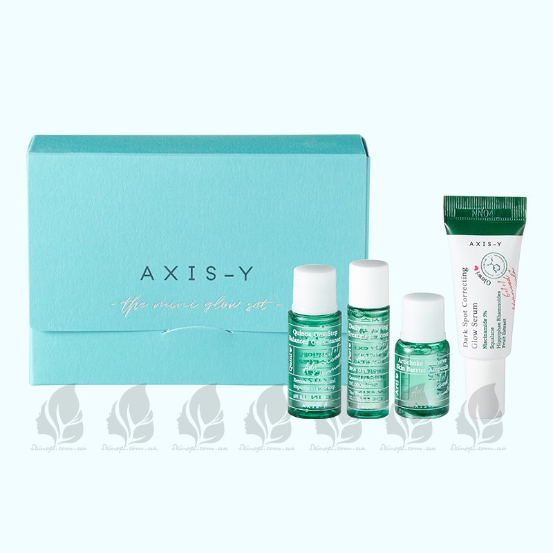 Набор миниатюр The Mini Glow Set, AXIS-Y - Cleanser 8 ml + Toner 5 ml + Ampoule 5 ml + Serum 5 ml + Gift Card + Stickers