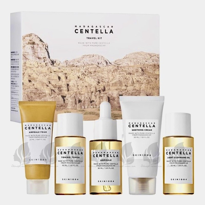 В наборе миниатюр с центеллой содержатся средства из линейки Madagascar Centella для базового ухода за кожей: гидрофильное масло, очищающее умывание, пенка для умывания, тонер, сыворотка и крем. Гидрофильное масло Centella Light Cleansing Oil подходит для всех типов кожи и идеально удаляет макияж, загрязнения, себум и солнцезащитный крем. Пенка для умывания Centella Ampoule Foam очищает лицо, стимулируя процессы регенерации кожи. Сыворотка Centella Ampoule обладает успокаивающими, противовоспалительными и регенеративными свойствами. Крем Centella Soothing Cream с насыщенной формулой успокаивает кожу и устраняет раздражение.