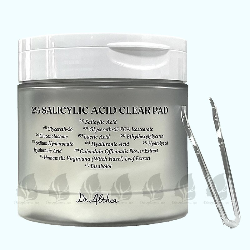 Отшелушивающие тонер-педы Dr. Althea 2% Salicylic Acid Clear Pad с салициловой кислотой предназначены для ухода за кожей с расширенными порами, повышенной жирностью, признаками фотостарения и несовершенствами. Эти педы содержат салициловую, лактобионовую и молочную кислоты, которые помогают очистить поры, уменьшить воспаление, ускорить обновление клеток, осветлить пигментацию, улучшить синтез гиалуроновой кислоты и улучшить текстуру кожи. В состав также входит растительный комплекс для успокоения и заживления кожи. Эти диски предназначены для работы с проблемной кожей.